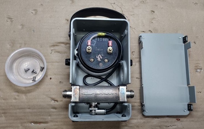 To perform the upgrade begin by removing the 4x screws that hold the rear portion of the enclosure. From opening up the enclosure you can see there is really not much when it come to complexity for the Bird 43 besides a current meter, line unit and slug.