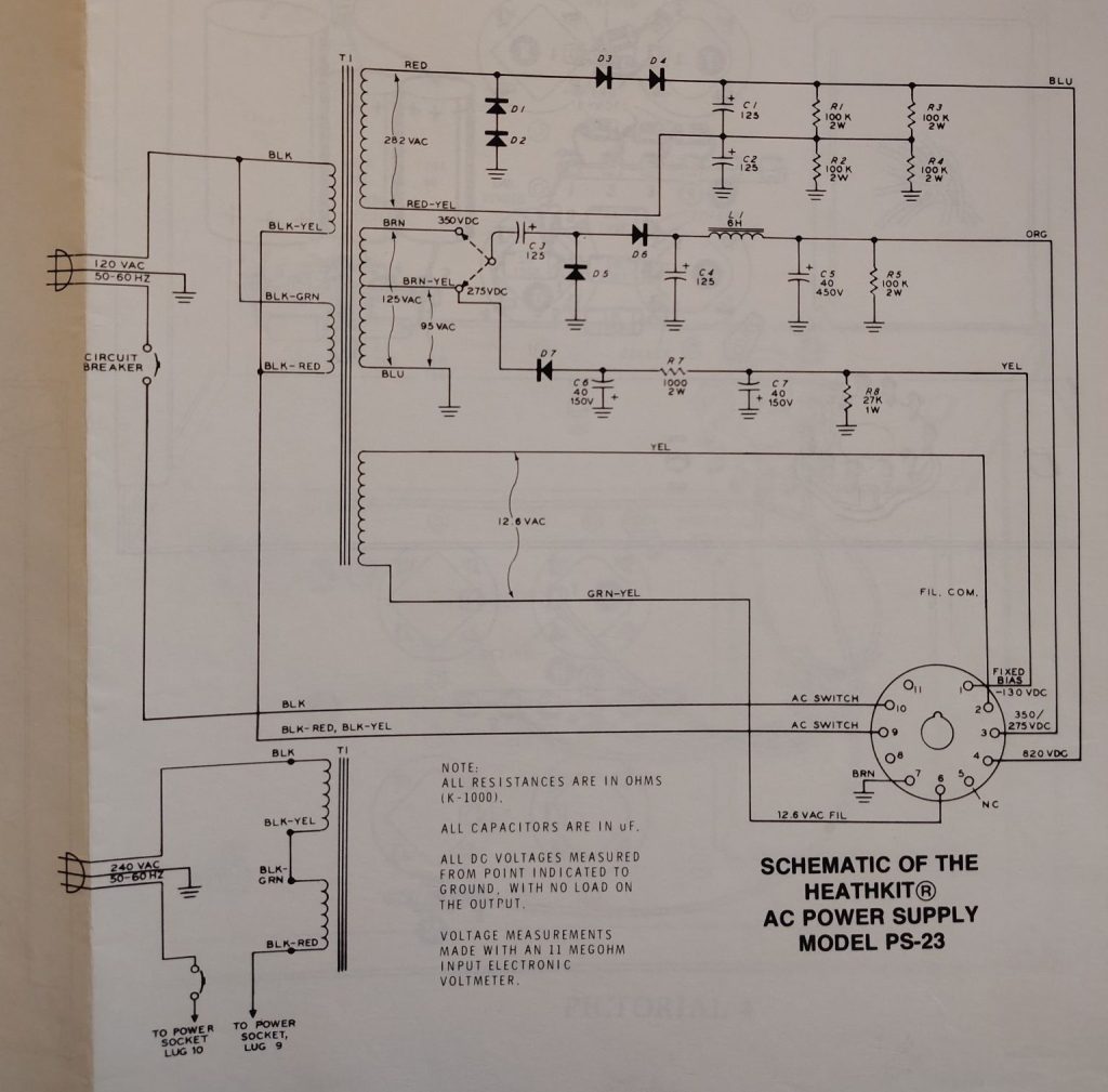 Below is a copy of the the schematic for the newer PS-23 model. Be aware that between the different model years there are some minor variations, specifically some models did not include a 6V Filament voltage out of contact 8 on the receptacle or a bias voltage on contact 11.