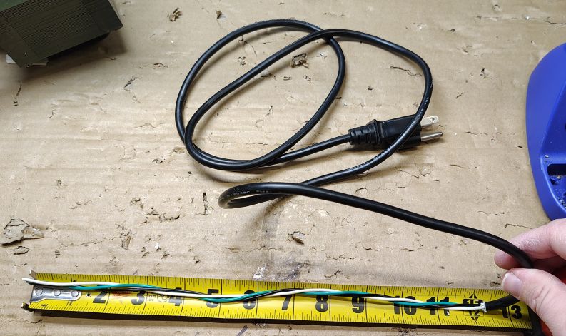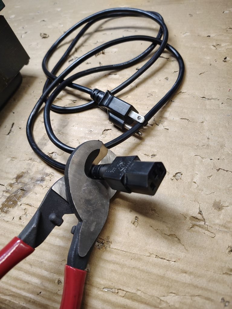 One of the goals for this rebuild was to replace the ungrounded/unpolarized AC plug with a modern 3 prong plug that included a chassis/safety ground. Refer to Figure 2 for the 120VAC Plug wiring. From my spare cable supply I utilized an old computer cable as shown below and removed the C13 connector as shown leaving the standard AC plug.