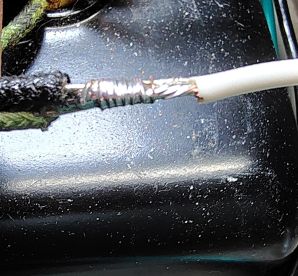 From the wires coming out of the transformer identify the Black and Black-Green wires. These wires get spliced into the neutral line coming from the AC plug. I opted to slide a piece of shrink sleeving over the wires and proceeded to solder a lashing splice.
