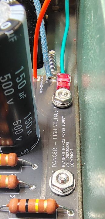 To get the length for the safety/chassis ground I temporarily placed the circuit board into the chassis and lined up the 4x mounting holes and routed the wire to the bottom right mounting hole and crimped on a ring terminal for a #6 fastener. The circuit board was removed from the chassis.