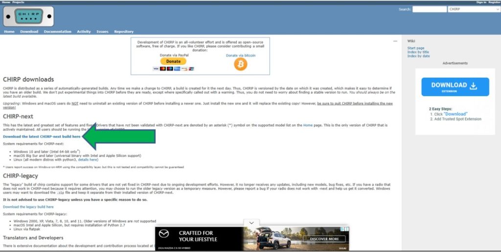 When using the CHIRP download page (https://chirpmyradio.com/projects/chirp/wiki/Download), be sure to click on the correct download link and not a pesky advertisement.