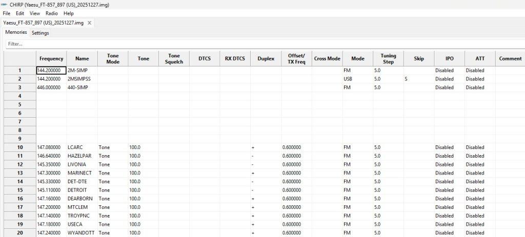 For programming software I decided on using CHRIP (https://chirpmyradio.com/) primarily because it is open source and free. This software can be used to program most main stream amateur radios that include a CAT programming port.
