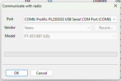 12. When the Communicate with radio window appears, again, select the COM that the cable enumerated to, ensure that the vendor and model fields are correct and press OK.
