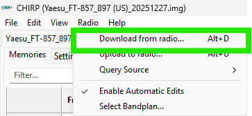 4. Its best to start a a new programming template is by pulling an existing template directly from the radio. To do so, within CHIRP, select Radio > Download from radio.