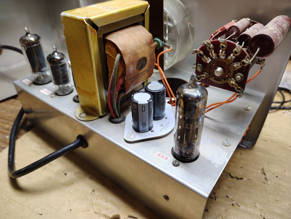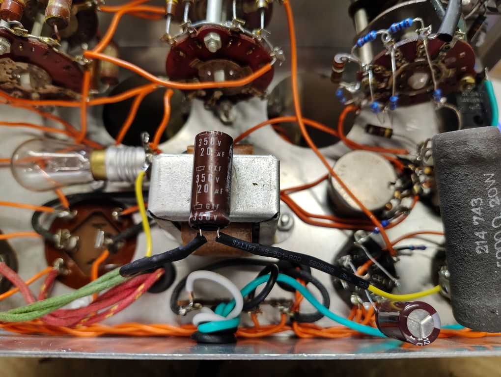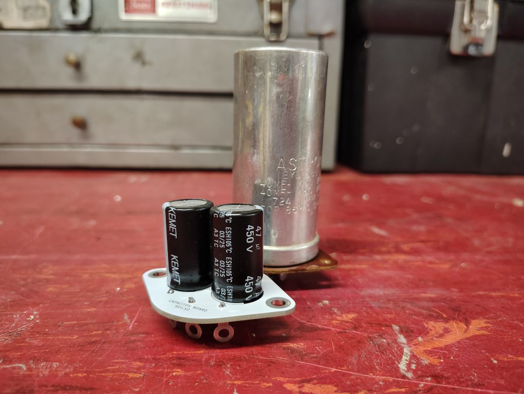 The original filtering capacitor consisted of a single cylindrical tin assembly that holds 2x 40uF capacitors. As technology has advanced the physical space claim of capacitors has been significantly reduced and the style of capacitor that was originally used on this Audio Generator is obsolete.