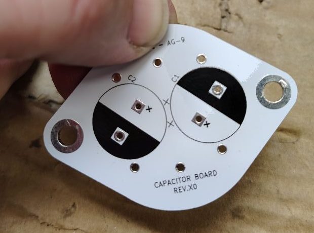 To come up with a suitable replacement I decided to design a PCB that would utilize the same screw mounting pattern include leads similar to the original capacitor but would utilize modern commonly available leaded capacitors. Specifically I decided on using common 47uF Electrolytic capacitors.